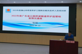 9月21-22日,为期两天的佛山市2023年度桥梁养护工程师及相关技术人员培训在佛山交通科技检测研发基地举行。本次培训由市交通运输事务中心主办、市公路学会承办。市交通运输事务中心、五区交通运输局以及一线施工管养、项目业主单位90人参加了培训学习。交通运输事务中心彭建波总工程师出席开班典礼并作开班动员讲话。